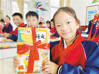 8月31日,郾城区东街小学开学当天,四(1)班学生领到了新书。陈 聪 摄