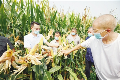 9月13日,在舞阳县马村乡碾王村,农业技术专家在田间察看玉米长势。