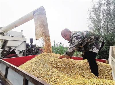 9月14日,在郾城区孟庙镇西营村,大型玉米联合收割机正在作业。