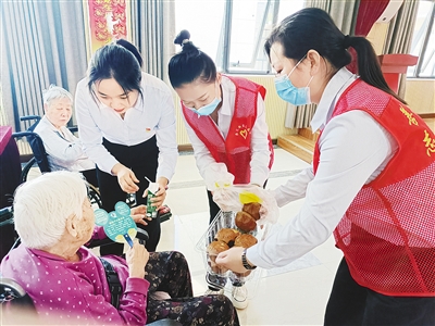 9月28日,源汇新区双龙社区组织志愿者到漯河万安老年公寓看望老人。