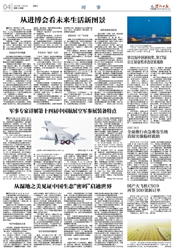 在博览会上,国产大飞机C919精彩亮相并进行了飞行表演,吸引了国内外民航企业的关注。前不久,C919获得了中国民航局颁发的型号合格证,获得投放市场运行的“入场券”。各方认为,这款喷气式干线客机拥有广阔的市场前景。