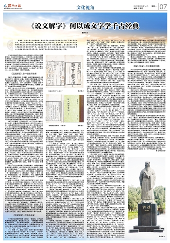 关于文字对中华文明延续和传承发展的重要性,许慎有着清醒而深刻的认识,他说:“盖文字者,经艺之本,王政之始,前人所以垂后,后人所以识古。故曰本立而道生,知天下之至啧而不可乱也。”(《说文·叙》)许慎的文字学思想和观念,即便在今天来看,依然具有重要的现代学术意义。许慎不仅通过探求文字构形与其负载的文化意义体现其文字学观念,而且《说文》还从理论和实践两个方面为汉字的阐释奠定了理论基础,深刻影响了传统文字学的发展。因此,阅读《说文》,首先必须真正地认识许慎,体会许慎撰著《说文》的用意,更好地领略《说文》的思想内涵和文化价值。