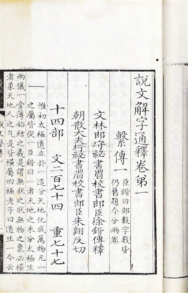 (一)所谓“2”,是指《说文》有两个通行的早期版本。《说文》通行本有“大徐本”和“小徐本”。“大徐本”就是徐铉校定的本子。徐铉,字鼎臣,初仕南唐,后归于宋。徐铉对《说文》进行了改易分卷、增加各字反切和新附字,也有少量补充《说文》的注释。“小徐本”则是徐铉胞弟徐锴校勘注释《说文》的本子。徐锴,字楚金,仕于南唐,逝于南唐覆亡前夕。徐锴有《说文解字系传》四十卷,分为“通释”“部叙”“通论”“祛妄”“类聚”“错综”“疑义”“系述”等部分,是全面注释和系统研究《说文》的首部著作。二徐对《说文》的传承贡献很大,二徐之后传习和研究《说文》都依据这两个版本。这两个版本也存在一定差异,可相互参看。