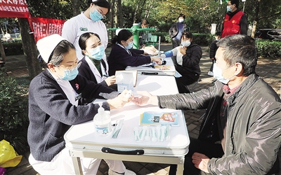11月14日是“联合国糖尿病日”。当天,市第三人民医院联合嵩山社区卫生服务中心在辽河路某小区开展义诊活动。图为医护人员为小区居民测血糖。