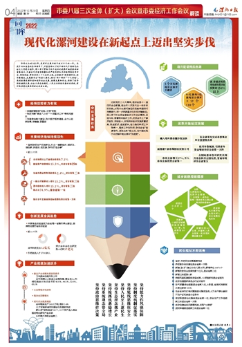 对标党的二十大精神,落实省委十一届四次全会部署,结合市八次党代会一年多来的实践,对现代化漯河建设的思路举措进行完善提升,进一步明确重点任务和关键路径;深入学习中央和省委经济工作会议精神,总结今年、部署明年经济工作,动员全市上下踔厉奋发、团结奋斗,实现明年经济发展质量更高、效益更好、速度更快,奋力推动单项工作争第一、整体工作创先进,争当全省“奋勇争先、更加出彩”排头兵,在中国式现代化进程中跑出漯河“加速度”。