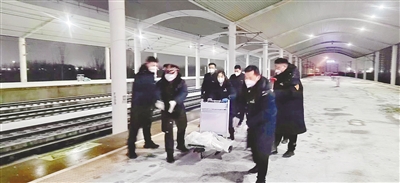 1月14日凌晨,漯河西站干部职工在站台区域撒盐,清理进出站通道并铺设防滑垫,为第二天乘车的旅客提供便利。本报记者 刘净旖 摄