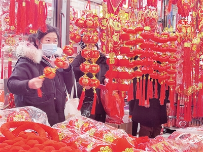 随着农历新年的临近,我市节日市场红红火火。图为1月16日,市民在光明路市场选购饰品。