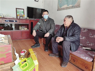 1月16日,市水利局党员志愿者为舞阳县辛安镇刘庄村15名脱贫监测户送去米、面、油等慰问品。图为志愿者慰问脱贫监测户朱振州(右)。