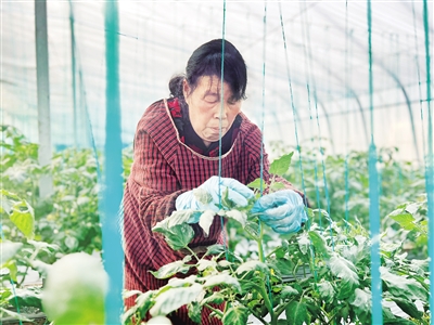 2月7日,在源汇区空冢郭镇王会朝村高效生态农业示范园温室大棚,村民正在为西红柿打叉、吊绳。