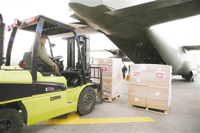2月7日,工作人员在突尼斯迦太基国际机场装载救援物资。突尼斯政府当日向土叙两国分别派出医务、救援人员并提供救援物资。