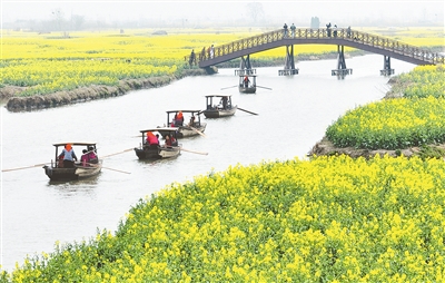 3月21日,游人在江苏省兴化市千垛菜花景区乘船游览(无人机照片)。最近,我国多地春暖花开,人们纷纷走到户外,赏花踏青,享受春光。