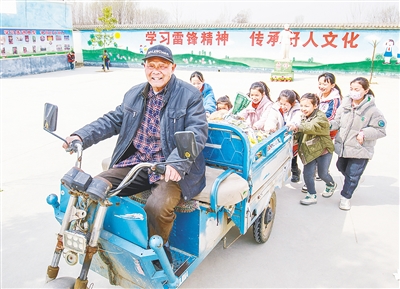 舞阳县保和乡路林村村民刘国强为朱耀环小学义务清运垃圾。
