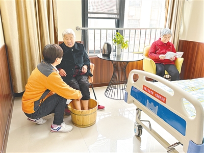 干河陈街道综合养老服务中心工作人员正在为老人洗脚。