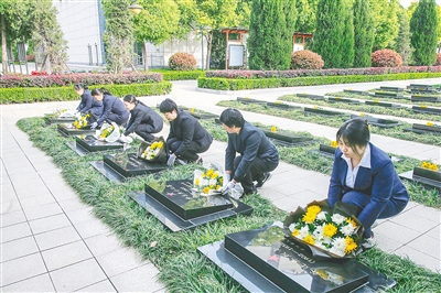 3月29日下午,市烈士陵园工作人员为英烈敬献鲜花。连日来,市烈士陵园分期分批组织开展代祭英烈活动,通过“四个一”(给烈属打一次电话、擦拭一遍烈士墓碑、向烈士敬献一束鲜花、拍摄一组祭扫照片或视频发送给烈士亲属),表达对英烈的崇敬和守护。本报记者 齐国霞 摄