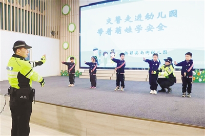4月7日,临颍县公安局交警大队民警走进辖区南街村幼儿园,开展交通安全宣传进校园活动。曹 娟 摄