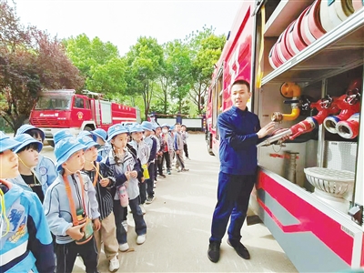 4月12日,茉莉宝贝幼儿园小朋友走进召陵区消防救援大队,体验消防生活并学习消防知识。图为消防员向小朋友介绍消防装备。本报记者 张玲玲 摄