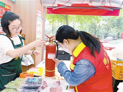 4月18日,郾城区沙北街道嵩山社区工作人员到辖区门店排查消防安全隐患。本报记者 张玲玲 摄