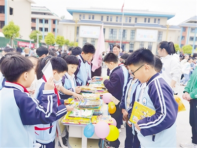 4月23日,嵩山路学校第二届校园读书节开幕。“跳蚤书市”作为读书节的活动之一,主要引导学生将自己闲置的图书与小伙伴进行交换、分享。当天下午,记者走进嵩山路学校,看到各书摊上科幻书、漫画书、小说、散文集等应有尽有。各“摊主”都使出了浑身解数推销自己的书,有的还拿起书到处兜售。为助力书香校园建设,市新华书店志愿者也带着500册图书参加该校的“书市”。学生们在书摊之间穿梭,寻找自己喜欢的书。整个活动现场书香四溢。