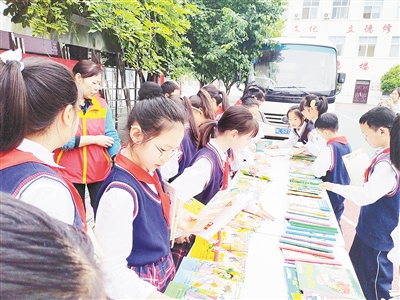 5月10日,市图书馆及李雪书馆志愿者到郾城区东街小学举行“图书漂流——送书进校园”活动。本报记者 尹晓玉 摄