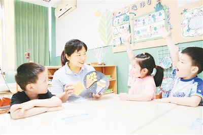 正是在这种发自本心的情感驱动下,刘宁霞一毕业就毫不犹豫地走上了幼师岗位。对她来说,幼儿园就像一个五彩斑斓的世界,能让她摒弃世俗功利,以自己的“儿童化”换取孩子对她的亲近感。她习惯蹲下去和孩子说话,抱起孩子交流,拉起孩子的手和他们一起做游戏。这些看似简单的举动,成为一道道彩虹,架在师心与童心之间。