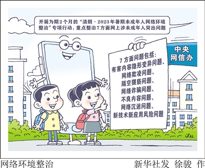为进一步强化未成年人网络保护,营造健康安全网络环境,中央网信办近日印发通知,开展为期两个月的“清朗·2023年暑期未成年人网络环境整治”专项行动,重点整治7方面网上涉未成年人突出问题。