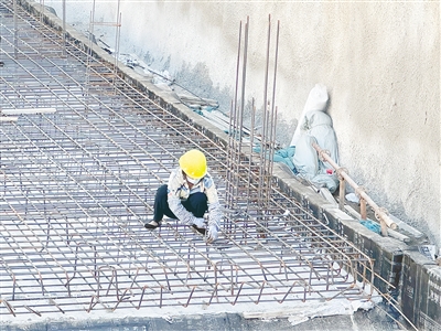 7月7日,在市区井冈山路一工地,工人进行钢筋连接作业。