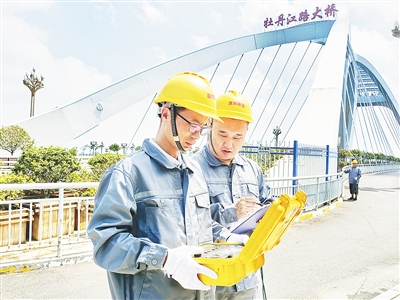7月27日,市气象局组织技术人员对市区部分桥梁开展防雷安全检测,防止因雷击引发灾害事故,确保汛期桥梁安全运行。图为技术人员对牡丹江路沙河桥进行检查和检测。