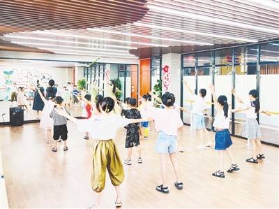 七月二十六日,召陵区翟庄街道燕山路社区儿童暑期公益课堂开班。图为志愿者教孩子们学习舞蹈。 本报记者 张丽霞 摄
