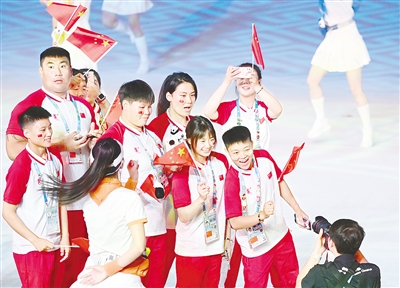 合着由大学生乐队现场演奏的音乐节奏,大学生运动员们入场了,全世界青年健儿在蜀绣铺就的锦绣之路上,去追寻他们的锦绣前程。成都的夜空下,年轻人彼此问候、热情相拥、与憨态可掬的“蓉宝”合影留念,欢声笑语随夜风飞扬……