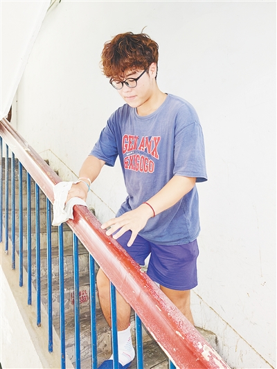 8月3日下午,记者来到位于市区交通路南段的汇鑫紫御嘉苑采访王圣博时,18岁的他正在楼道里拿着一块抹布擦楼梯扶手。这个身高1.84米的帅小伙笑笑说:“我上下楼时习惯擦一下扶手,这样大家就不会弄一手灰了。”