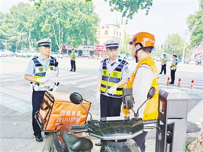 本报讯(记者 张玲玲)“你好!你骑的电动自行车属于非机动车,不允许走机动车道。”8月10日中午,在市区泰山路与黄河路交叉口,交警正在对一名外卖员进行教育。