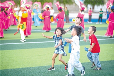 8月9日,小朋友在五常市时代中学集中安置点玩耍。