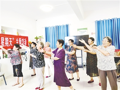 左图:海河社区日间照料中心,老人们在工作人员的指导下排练节目。