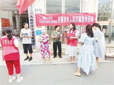 8月14日,郾城区沙北街道大高庄社区志愿者在辖区开展老年人防诈骗宣传活动。本报记者 刘净旖 摄