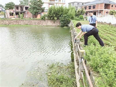 召陵区人民检察院干警对被污染的河道进行取水化验