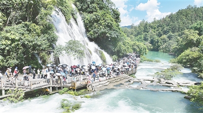 日前,前往贵州省荔波小七孔风景区游玩的游客激增,景区各部门通力合作,服务游客,每天迎客超过6.2万人次。