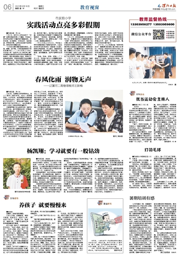 暑假即将结束,市实验小学的同学们都有了不少收获。该校家长代表说:“家长要学着缓解自己的焦虑情绪,让孩子在暑假好好放松,积极参加学校组织的实践活动,丰富暑假生活、增长见识。”