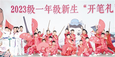 8月30日,海口市玉沙实验学校的武术队在“开笔礼”仪式活动现场表演。当日,海口市玉沙实验学校举行一年级新生“开笔礼”仪式。小朋友们在活动上感受传统文化,开启新的学习生活。 新华社记者 樊雨晴 摄