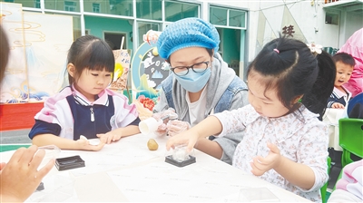 9月26日,市商业幼儿园开展“月圆映中秋 童心庆国庆”主题活动。图为孩子们与家委会代表一起做月饼。本报记者 王嘉明 摄