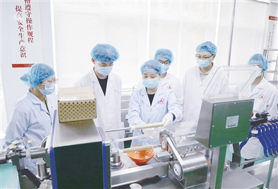 在中试基地食品加工生产线,导师现场教学。本报记者 范子恒 摄