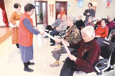 10月19日,在重阳节即将来临之前,漯河市心身平衡养生操公益团队的十多名志愿者来到漯河万安养老公寓,为老人们表演精彩的文艺节目,教老人们做养生保健操,给老人们发放健身棒,祝愿老人们健康长寿。本报记者 齐国霞 摄