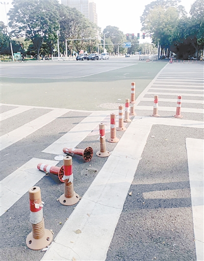 海河路与嵩山北路交叉口西北角,人行道桩倒地。