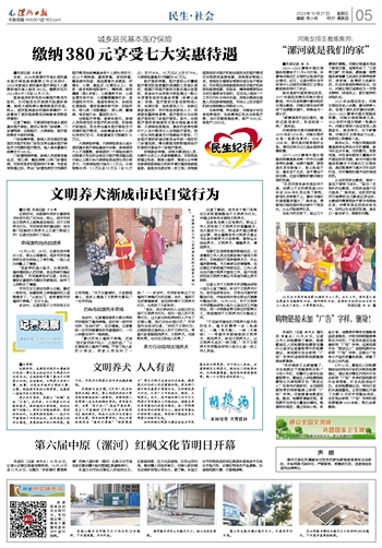 在源汇区老街街道受降路社区,记者看到工作人员正在挨家挨户宣传文明养犬,引导居民不饲养禁养犬只、外出遛狗要牵绳、犬只粪便及时清理等。在召陵区天桥街道万祥街社区,工作人员也在开展文明养犬宣传工作,逐户向居民发放文明养犬倡议书和城市禁止养犬图样。