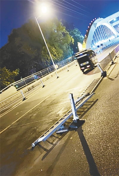 泰山路沙河桥北段,护栏倒地。