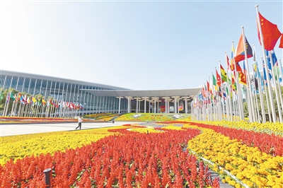 第六届中国国际进口博览会即将在上海举行,国家会展中心(上海)装点一新,迎接八方客商。