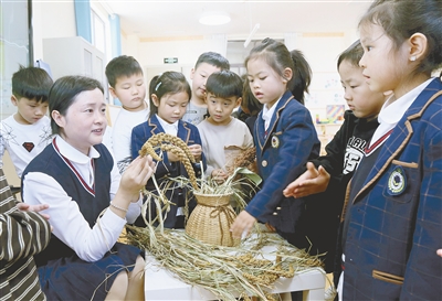 10月31日,河南省洛阳市汝阳县新华园幼儿园老师教小朋友们识别谷子,提醒大家珍惜粮食。