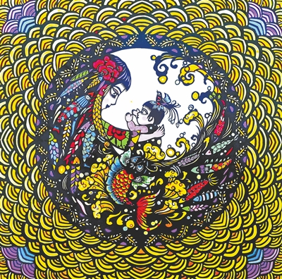 孟少雄创作的这幅作品采用了套色综合的剪纸艺术形式,四周是水纹环绕,中间把黄河比作母亲在拥抱、滋养华夏子孙。整个色调为黄色,主题突出、意境深远、色彩丰富。