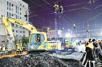 11月15日夜间,在济南火车站,中铁十局的工作人员正在对济郑高铁引入济南站进行站改作业。