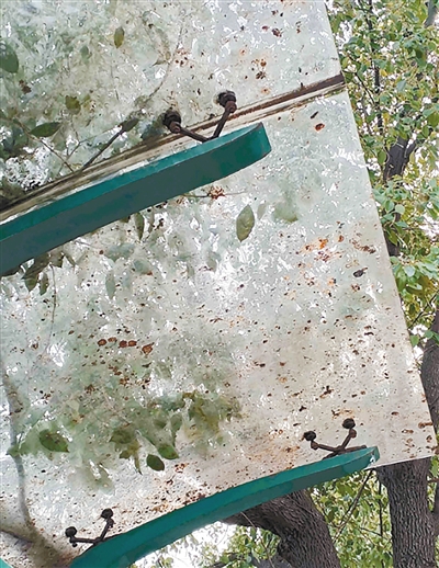 滨河东路与光明路交叉口向东约90米路北,公交车停靠点顶棚脏污。