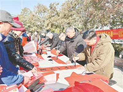 1月26日,由市文联、郾城区文联共同举办的“百花迎新乐中原——2024漯河·郾城区文艺界新春欢乐行活动”在黄河广场举行。图为书画名家为群众义写春联。本报记者 王嘉明 摄